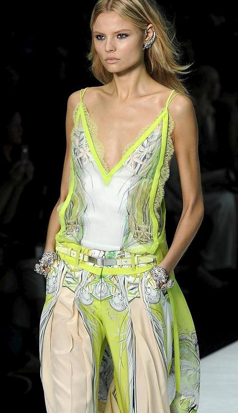 La firma italiana Roberto Cavalli logró lanzar al mercado una completa colección destinada a crear la imagen de una mujer que camina ligera y firmemente, dándole movimiento a su cuerpo con largos vestidos de encaje y capas de variadas telas voluptuosas.
